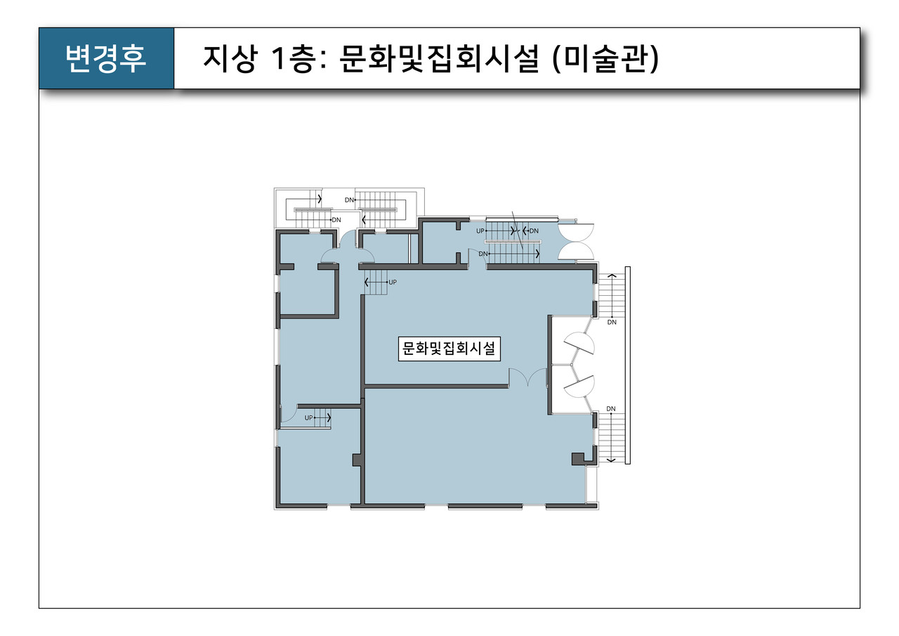 - 용도변경(허가) : 지상 1층 근린생활시설(소매점, 일반음식점) ▶ 문화및집회시설(미술관)